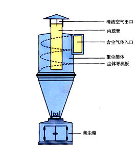 旋风气流的绝大部分沿器壁自圆简体,呈螺旋状由上向下向圆锥体底部运动,形成下降的外旋含尘气流,在强烈旋转过程中所产生的离心力将密度远远大于气体的尘粒甩向器壁,尘粒一旦与器壁接触,便失去惯性力而靠入口速度的动量和自身的重力沿壁面下落进入集灰斗。旋转下降的气流在到达圆锥体底部后,沿除尘器的轴心部位转而向上,形成上升的内旋气流,并有除尘器的排气管排出。自进气口流入的另一小部分气流,则向旋风除尘器顶盖处流出,然后沿排气管外侧向下流动,当达到排气管下端时,即反转向上随上升的中心气流一同从排气管排出,分散在其中的尘粒也随同被带走。